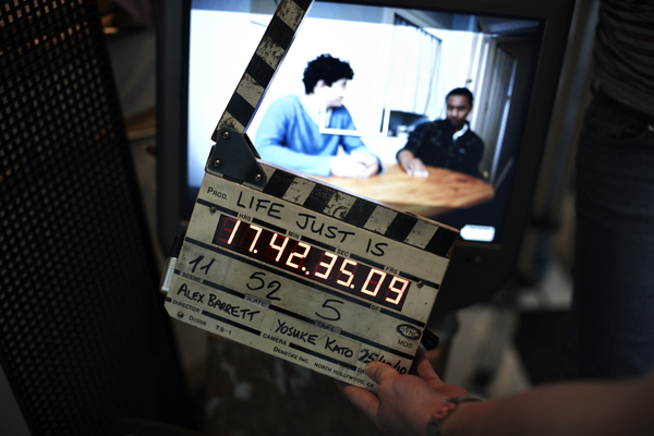 Actors Jack Gordon (left) and Nathaniel Martello-White (right) get ready for a take.